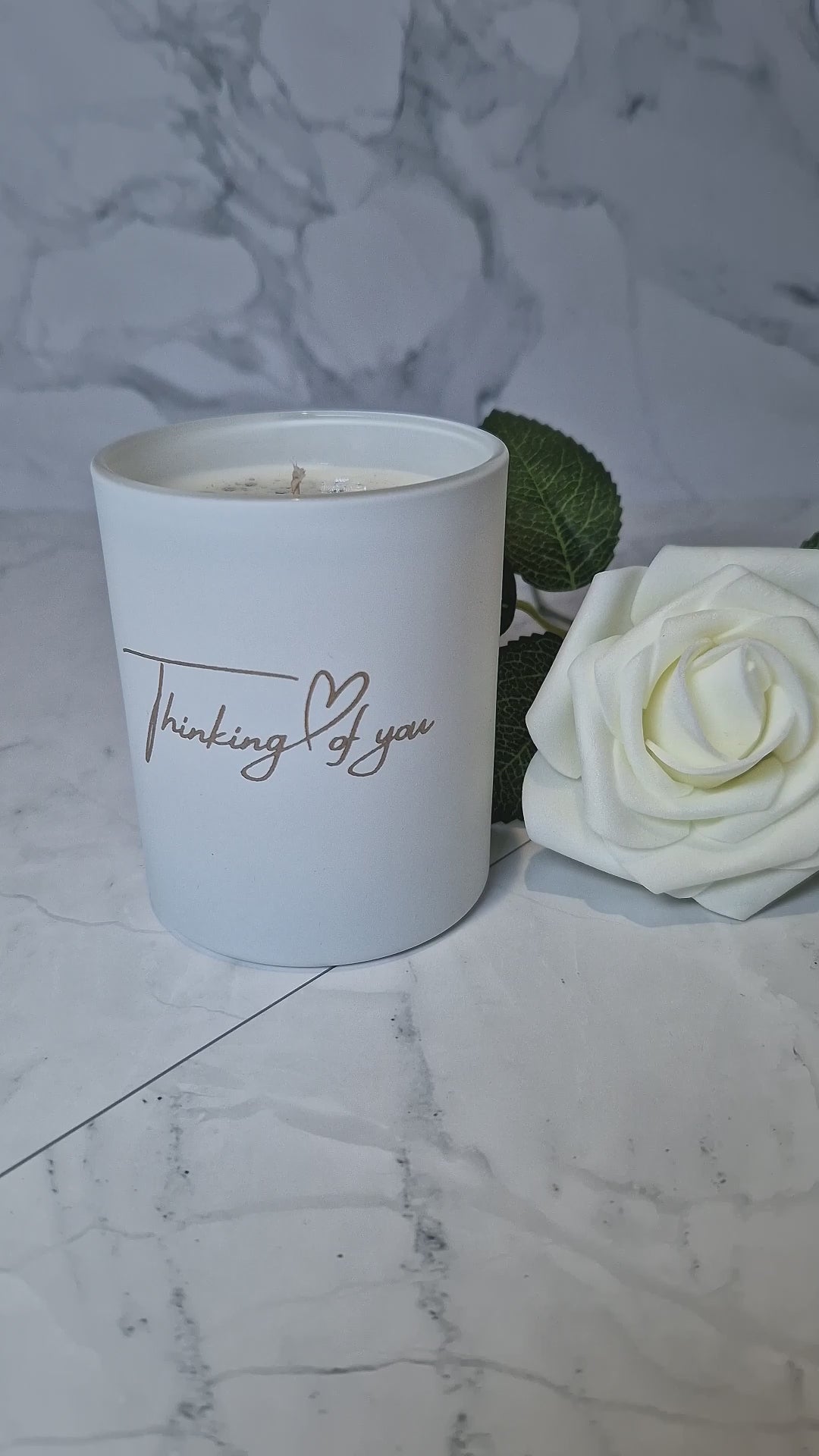 Illuminate someone's day with the soft, comforting light of our 'Thinking of You' candle, a timeless expression of empathy and love. Let this elegant, hand-crafted candle be a beacon of your thoughtfulness, bringing warmth and peace to those who need it most.